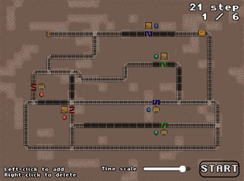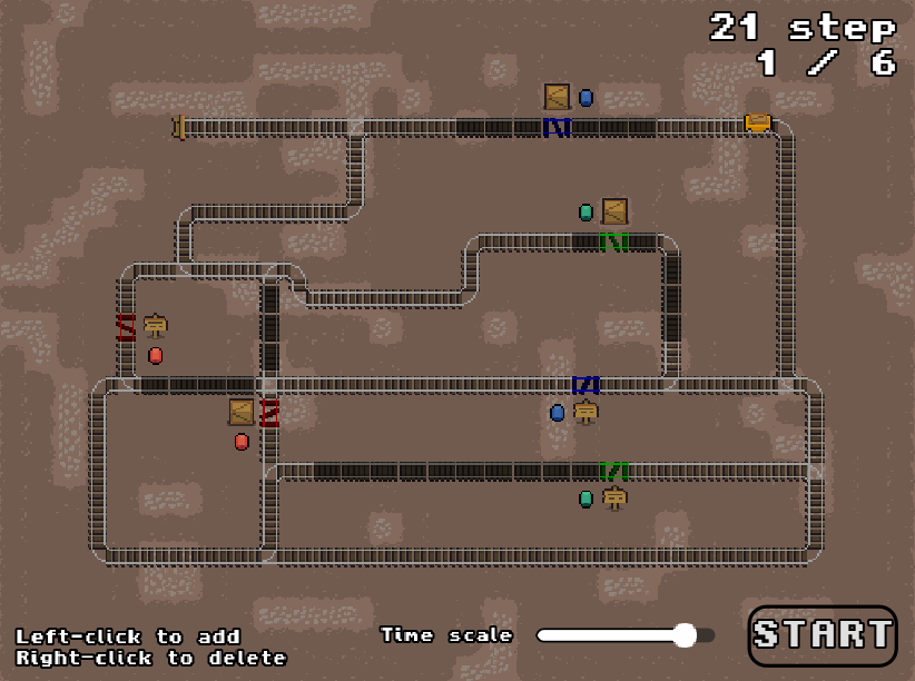 Build a railway so your cart stops at every station in the right order. Stations marked with a box are pick-up points; stations with a sign are drop-off points.